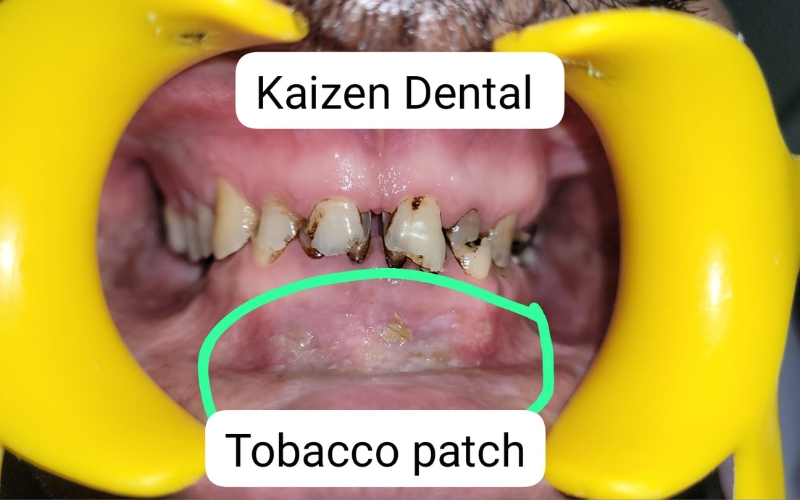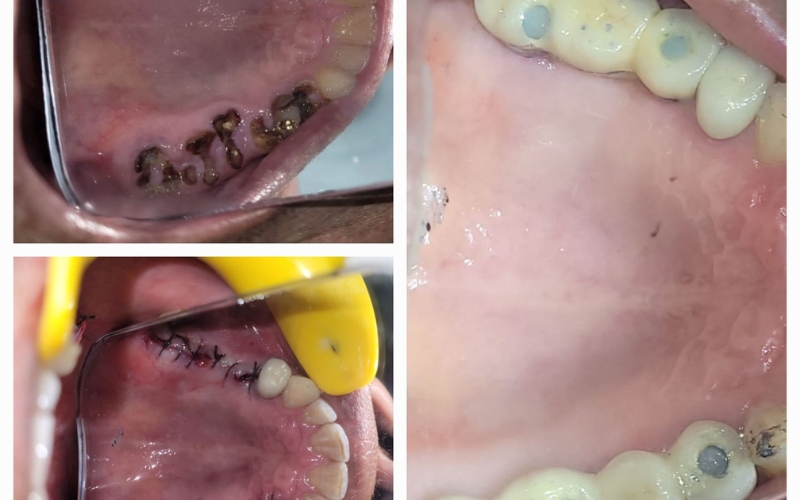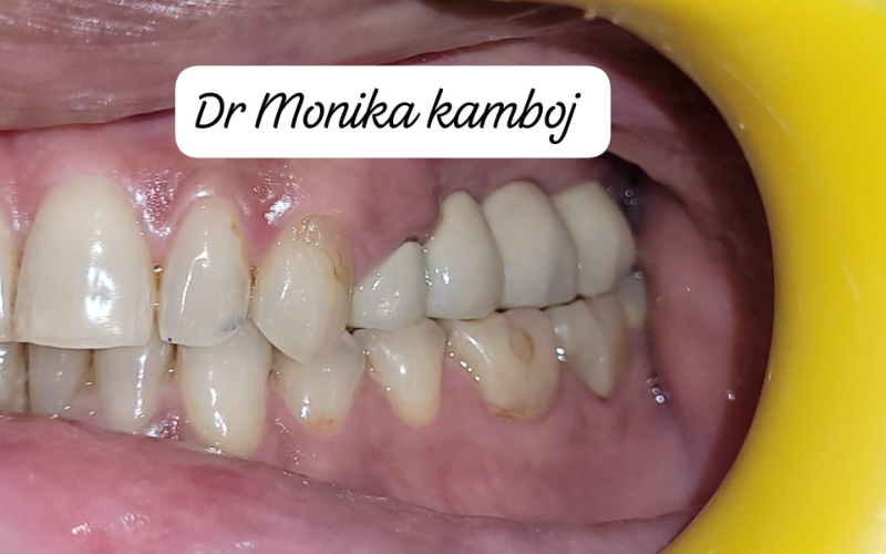 Young male patient with habit of tobacco chewing lost most of his tooth structure and presented with infection in multiple teeth. Multiple root canal treatments were done followed by metal ceramic crowns and bridges on all teeth.