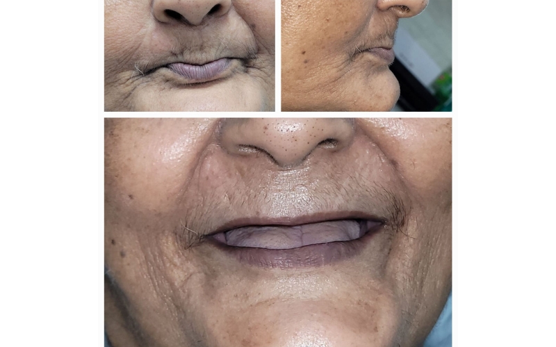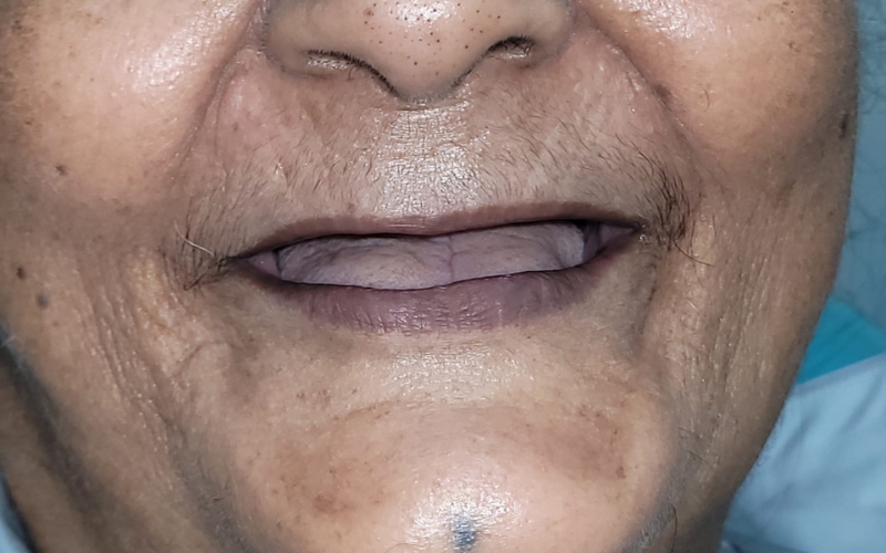 The patient had lost all her teeth in the upper jaw and posterior teeth in the lower jaw. The upper arch was restored with a fixed ceramic bridge supported by 7 dental implants, while a removable flexible denture was provided for the lower posterior teeth—restoring function, comfort, and a confident smile.